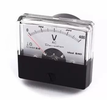 An analog voltmeter uses a needle and scale to display the measured voltage.