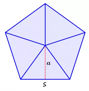 If we join each vertex to the center of the geometric figure, we will have five equilateral triangles left. We will also obtain the total surface with the sum of the surface of these five triangles.